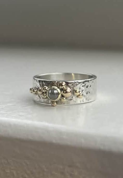 Guldbobler bryder det kølige sølv med varme nuancer, mens en guldfatning indrammer en rose cut diamant.